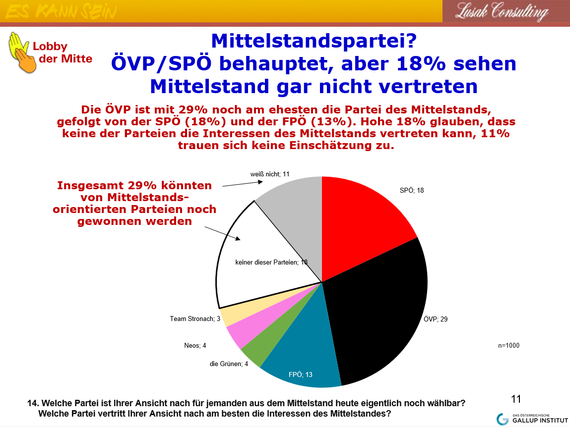 - 63% der Österreicher halten den Mittelstand für sehr wichtig, eine Mehrheit wünscht ihm stärkere Interessenvertretung, ein Drittel bekennt sich zu ihm, 18% glaubt, dass keine der bestehenden Parteien ein Partei für den Mittelstand ist!