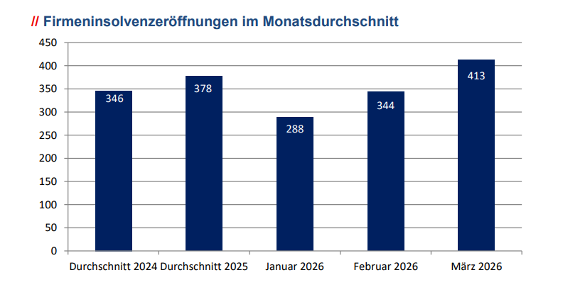 - Die ersten 3 Monate des Jahres 2026 zeigen eine weiterhin angespannte Wirtschaftslage; die 1.045 eröffneten Firmeninsolvenzen liegen nur um 7,77 % hinter den Werten des Rekordpleitenjahres 2025.